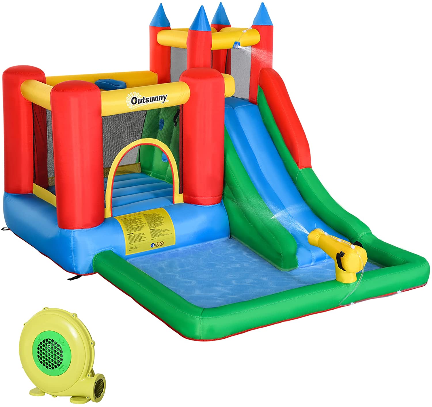 Aufblasbarer Spielplatz für Kinder 3-8 Jahre mit Rutsche und Pool 330x245x215cm. Die Outsunny-Hüpfburg ist ideal für Ihre Kinder! Es bietet Platz für bis zu 4 Kinder gleichzeitig, die mit dem Trampolin, der Kletterwand, der Rutsche oder dem Pool, der mit Wasser oder Bällen (nicht im Lieferumfang enthalten) gefüllt werden kann, spielen können. Eine Wasserkanone sorgt für noch mehr erfrischenden Sommerspaß. Im Lieferumfang enthalten sind Reparaturflicken für eventuelle Missgeschicke und Erdnägel zum Einstecken in den Boden. Hier zu spielen wird großartig sein! Merkmale: – Schnelles Aufblasen mit dem mitgelieferten elektrischen Inflator – Mehrere Spielbereiche für Kinder zur Unterhaltung – Inklusive Tragetasche, 5 Pflöcke und 10 Aufnäher (2 pro Farbe) – Geeignet für den Innen- und Außeneinsatz – Hergestellt aus langlebigen und sicheren Materialien – Für 4 Kinder gleichzeitig, ohne 120 kg zu überschreiten Technische Daten: – Farbe: Multicolour – Material: Oxford-Gewebe, Polyester-Gewebe – Gesamtabmessungen: 330L x 245P x 215Acm – Maße des Trampolins: 135L x 125Pcm – Maße des Pools: 20 x150cm – Maße der Rutsche: 180x55cm – Empfohlenes Alter: 3-8 Jahre – Maximale Belastung: 120 kg – Leistung des Inflators: 450W – Zertifizierungen: EN71-1 -2 -3, EMC, LVD und ROHS Paketinhalt: – 1 x Hüpfburg – 1 x Transporttasche – 10 x Aufnäher – 1 x Flexibler Schlauch – 5 x Heringe – 1 x Inflator – 1 x Gebrauchsanweisung
