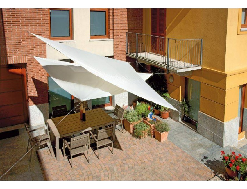 Dreieckiges Gartensegel, 5m, Persenning, Schattentuch. Dreieckige Form und ideal, um sonnengeschützte Tage mit Freunden und Verwandten zu verbringen, Mittag- und Abendessen zu organisieren und vieles mehr.Der Bezug besteht aus Polyester, einem hervorragenden Textilmaterial. Es ist langlebig, unverformbar, knitterarm, hat ein ausgezeichnetes Rückstellvermögen, ist abrieb-, licht- und hitzebeständig; es ist auch atmungsaktiv und aseptischBesonders hervorzuheben ist die Tatsache, dass Polyestergewebe die Vermehrung von Schimmelpilzen und Mikroorganismen nicht zulassen.BEZEICHNUNGTyp: Segel für Gartenmöbel Form: Dreieckig Bezug aus harzbeschichtetem Polyestergewebe 180 g, Farbe ecru (Naturfarbe der Fasern, ohne Behandlungen) Inklusive 3 x 3,5 m Seile MASSE5X5X5 m