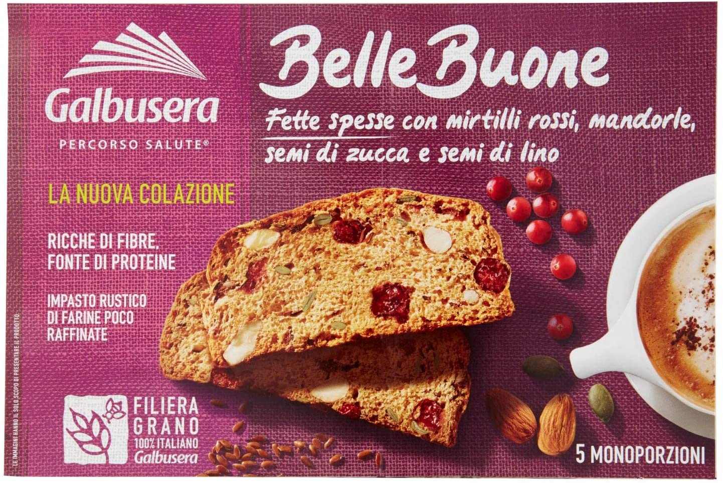 Galbusera Belle Buone Fette Biscottate Cranberries und Mandeln, 200g. Fette Biscottate mit Einschlüssen von Früchten, Nüssen und Samen. Ideal für das Frühstück. In praktischen Einzelportionen. Dieses Produkt wurde mit viel Liebe zum Detail entwickelt, so dass der Anwender von der ersten Sekunde an die optimale Qualität spüren kann. Eine optimale Balance zwischen Kundenbedürfnissen und wohlverdienter Verwöhnung.SCHEIBEN MIT CRANBERRIES, MANDELN UND KÜRBISKERNEN. Ideal für das Frühstück, KREATIV und RÖSTLICH, dank der Mischung aus unraffinierten Mehlen und Einschlüssen von ganzen oder gehackten Früchten.Zutaten: Weizenmehl Typ “2” 38,4%. Frische pasteurisierte Vollmilch hoher Qualität Weizenvollkornmehl 16% Dehydrierte Cranberries 10,7% (Cranberries, Zucker, Sonnenblumenöl) Zucker Mandeln 9,4% PRODUKT IN EINER SCHUTZATMOSPHÄRE VERPACKT.WARNUNG FÜR ALLERGIKER Das Produkt kann Soja, Haselnüsse und andere Nüsse enthalten, daher ist es nicht für den Verzehr durch Personen geeignet, die auf diese Stoffe allergisch reagieren.Die Packung enthält 10 Scheiben. 5 Portionen