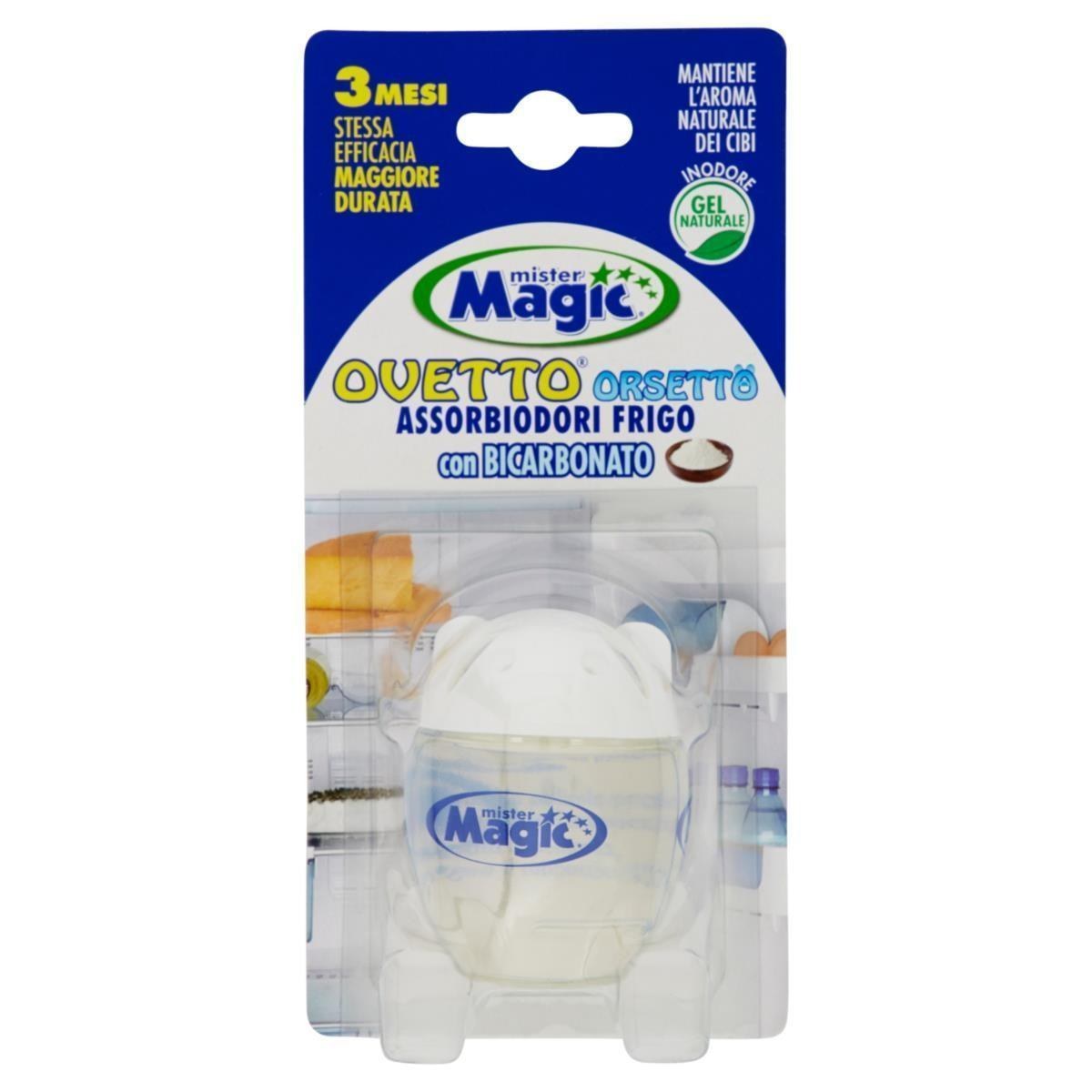 Mister Magic* Ovetto* con bicarbonato Assorbe Tutti gli Odori forti presenti nel frigorifero (pesce, formaggio, cipolle, ecc.), grazie alla sua formulazione che Cattura e Trattiene gli Odori come una spugna. La Formulazione, Inodore e con Gel Naturale, mantiene inalterato il gusto e l’aroma dei cibi conservati. È Pratico, grazie alle piccole dimensioni e alla sua forma può essere posizionato stabilmente nel comparto delle uova. È facile verificare quando il prodotto è esaurito, grazie al segnale di esaurimento presente sulla parte bassa del contenitore. Una confezione è efficace per un frigo fino a 200 litri per 3 mesi. Disponibile anche nelle versioni con estratti naturali di limone e con aceto naturale.