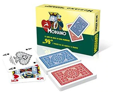 Spielkarten Modiano, Italienische Pokerkarten, Ramino, Burraco, Maßstab 40, 54 x2 plastifizierte Karten, 98 Karten Deck. Italienische Pokerkarten Modiano aus Kunststoff. Ideal für Poker, Ramino usw. Set mit zwei 54-Karten-Decks, mit roter und blauer Rückseite Spielkarten sind im Vergleich zu Kartonkarten schwieriger zu zerreißen und zu falten Der geschützte Aufdruck auf der Rückseite erschwert das Markieren.