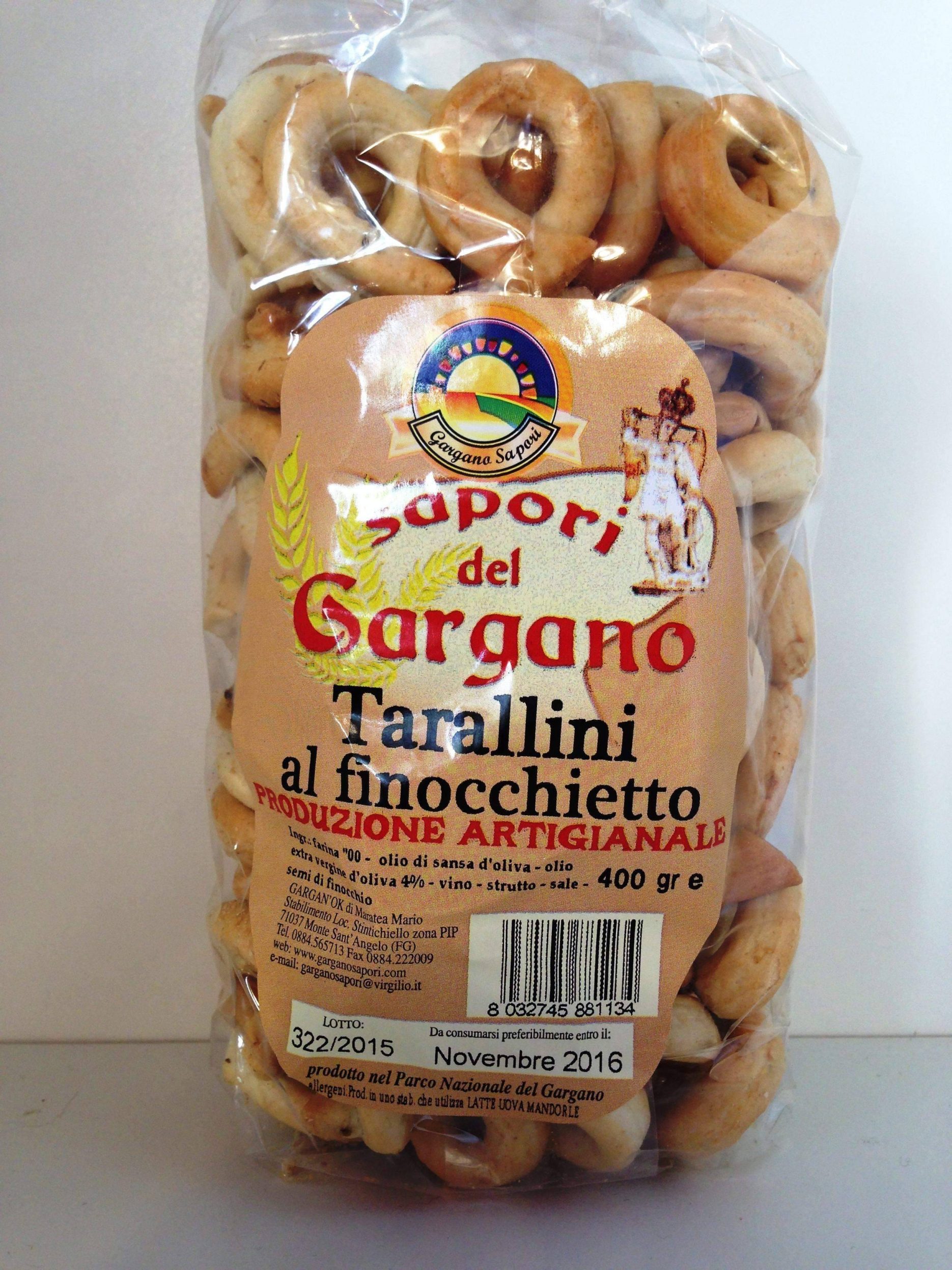 Tarallini mit Fenchelaroma, handgefertigt, 400 gr. Die Tarallini sind traditionell aus Apulien und werden von Hand hergestellt. Sie haben eine runde Form und werden in Packungen zu 250 g verkauft. Sie sind echt und knusprig, ideal als Aperitif oder Snack und zu einem Glas Wein. Geschichte: Die Tradition besagt, dass sie von Bauern gefressen wurden, die auf den Feldern arbeiteten und den ganzen Tag draußen blieben. Heute ist diese Sorte apulischer Taralli als Brot wichtig geworden und dank ihrer nahrhaften und gesunden Eigenschaften, die gleichzeitig jeden Geschmack befriedigen, Teil der mediterranen Ernährung geworden. Zutaten: 00 Mehl, Olivenöl extra vergine (4%), Oliventrester 16%, Weißwein, Wasser, Salz, Fenchelsamen. Frist: 12 Monate