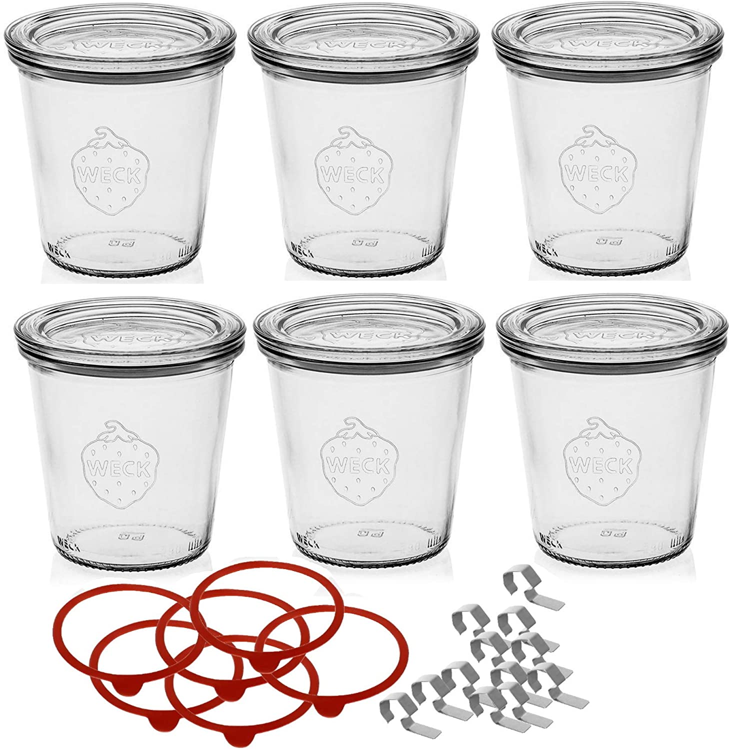 Weck glas 290 ml mit Deckel 80 mm, komplett mit Dichtung und Clips, 6er-Pack, Glas, transparent